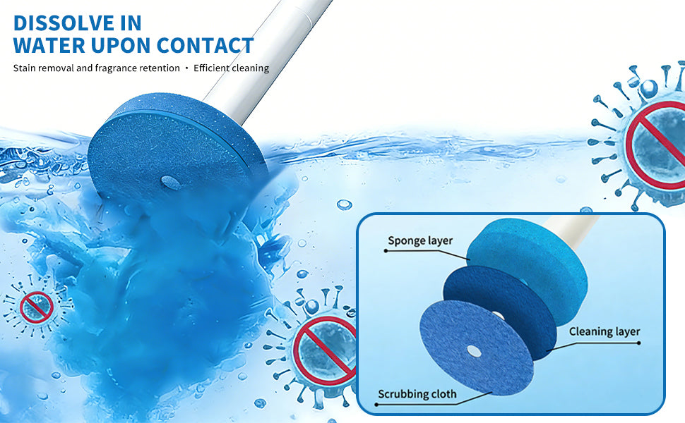 Each brush head is pre-loaded with powerful, multi-purpose cleaning formula. After scrubbing, simply press the button to release the disposable head directly into the toilet — no touching dirty bristles, no lingering odors, no cross-contamination. Your hands stay clean, your bathroom stays germ-free.